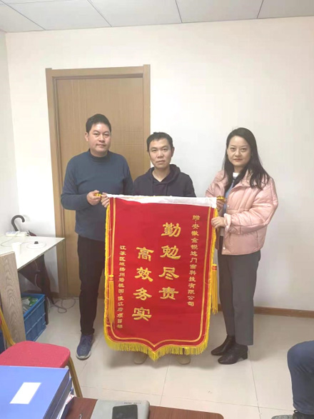 2022年2月25日,碧桂園江蘇區(qū)域揚(yáng)州碧桂園陵江府項目部向我公司贈送錦旗,錦旗上書“勤勉盡責(zé)高效務(wù)實(shí)”,對我公司為項目部提供及時有效的售后服務(wù)表示感謝。